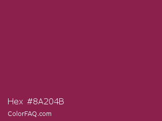 Hex #8a204b Color is a normal rose color and the nearest color is Disco #871550. Hex code #8a204b and RGB value is rgb(138,32,75). In RGB color space, this color is composed of 54% red, 13% green, 29% blue, In CMYK color space, this color is composed of 0% cyan, 77% magenta, 46% yellow , 46% black , In HSL color space, this color has a hue angle of 336° , 62% saturation and 33% lightness.