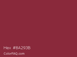 Hex #8a293b Color is a normal red color and the nearest color is Solid Pink #893843. Hex code #8a293b and RGB value is rgb(138,41,59). In RGB color space, this color is composed of 54% red, 16% green, 23% blue, In CMYK color space, this color is composed of 0% cyan, 70% magenta, 57% yellow , 46% black , In HSL color space, this color has a hue angle of 349° , 54% saturation and 35% lightness.