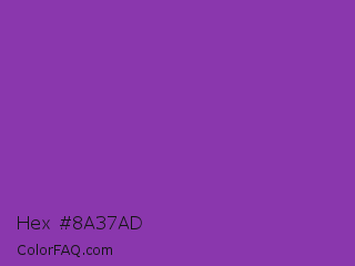 Hex #8a37ad Color is a normal purple color and the nearest color is Purpureus #9a4eae. Hex code #8a37ad and RGB value is rgb(138,55,173). In RGB color space, this color is composed of 54% red, 22% green, 68% blue, In CMYK color space, this color is composed of 20% cyan, 68% magenta, 0% yellow , 32% black , In HSL color space, this color has a hue angle of 282° , 52% saturation and 45% lightness.