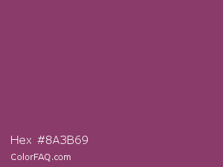 Hex #8a3b69 Color is a normal magenta color and the nearest color is Cannon Pink #894367. Hex code #8a3b69 and RGB value is rgb(138,59,105). In RGB color space, this color is composed of 54% red, 23% green, 41% blue, In CMYK color space, this color is composed of 0% cyan, 57% magenta, 24% yellow , 46% black , In HSL color space, this color has a hue angle of 325° , 40% saturation and 39% lightness.
