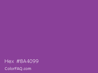 Hex #8a4099 Color is a normal purple color and the nearest color is Vivid Violet #803790. Hex code #8a4099 and RGB value is rgb(138,64,153). In RGB color space, this color is composed of 54% red, 25% green, 60% blue, In CMYK color space, this color is composed of 10% cyan, 58% magenta, 0% yellow , 40% black , In HSL color space, this color has a hue angle of 290° , 41% saturation and 43% lightness.