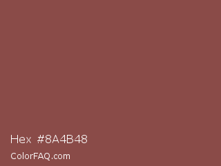 Hex #8a4b48 Color is a normal red color and the nearest color is Spicy Mix #885342. Hex code #8a4b48 and RGB value is rgb(138,75,72). In RGB color space, this color is composed of 54% red, 29% green, 28% blue, In CMYK color space, this color is composed of 0% cyan, 46% magenta, 48% yellow , 46% black , In HSL color space, this color has a hue angle of 3° , 31% saturation and 41% lightness.