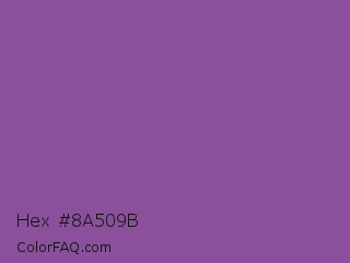 Hex #8a509b Color is a normal purple color and the nearest color is Trendy Pink #8c6495. Hex code #8a509b and RGB value is rgb(138,80,155). In RGB color space, this color is composed of 54% red, 31% green, 61% blue, In CMYK color space, this color is composed of 11% cyan, 48% magenta, 0% yellow , 39% black , In HSL color space, this color has a hue angle of 286° , 32% saturation and 46% lightness.