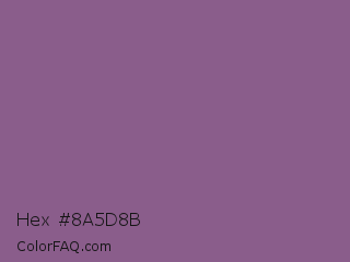 Hex #8a5d8b Color is a normal magenta color and the nearest color is French Lilac #86608e. Hex code #8a5d8b and RGB value is rgb(138,93,139). In RGB color space, this color is composed of 54% red, 36% green, 55% blue, In CMYK color space, this color is composed of 1% cyan, 33% magenta, 0% yellow , 45% black , In HSL color space, this color has a hue angle of 299° , 20% saturation and 45% lightness.
