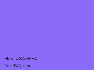 Hex #8a6bfa Color is a light indigo color and the nearest color is Medium Slate Blue #7b68ee. Hex code #8a6bfa and RGB value is rgb(138,107,250). In RGB color space, this color is composed of 54% red, 42% green, 98% blue, In CMYK color space, this color is composed of 45% cyan, 57% magenta, 0% yellow , 2% black , In HSL color space, this color has a hue angle of 253° , 93% saturation and 70% lightness.