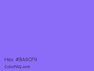 Hex #8a6cf9 Color is a light indigo color and the nearest color is Medium Slate Blue #7b68ee. Hex code #8a6cf9 and RGB value is rgb(138,108,249). In RGB color space, this color is composed of 54% red, 42% green, 98% blue, In CMYK color space, this color is composed of 45% cyan, 57% magenta, 0% yellow , 2% black , In HSL color space, this color has a hue angle of 253° , 92% saturation and 70% lightness.