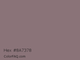 Hex #8a7378 Color is a normal red color and the nearest color is Hemp #907874. Hex code #8a7378 and RGB value is rgb(138,115,120). In RGB color space, this color is composed of 54% red, 45% green, 47% blue, In CMYK color space, this color is composed of 0% cyan, 17% magenta, 13% yellow , 46% black , In HSL color space, this color has a hue angle of 347° , 9% saturation and 50% lightness.