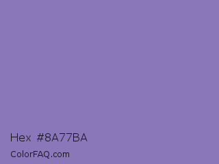 Hex #8a77ba Color is a normal indigo color and the nearest color is Middle Blue Purple #8b72be. Hex code #8a77ba and RGB value is rgb(138,119,186). In RGB color space, this color is composed of 54% red, 47% green, 73% blue, In CMYK color space, this color is composed of 26% cyan, 36% magenta, 0% yellow , 27% black , In HSL color space, this color has a hue angle of 257° , 33% saturation and 60% lightness.