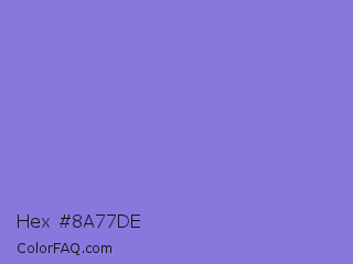 Hex #8a77de Color is a light indigo color and the nearest color is True V #8a73d6. Hex code #8a77de and RGB value is rgb(138,119,222). In RGB color space, this color is composed of 54% red, 47% green, 87% blue, In CMYK color space, this color is composed of 38% cyan, 46% magenta, 0% yellow , 13% black , In HSL color space, this color has a hue angle of 251° , 61% saturation and 67% lightness.