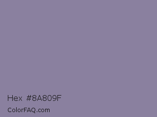 Hex #8a809f Color is a normal indigo color and the nearest color is Roman Silver #838996. Hex code #8a809f and RGB value is rgb(138,128,159). In RGB color space, this color is composed of 54% red, 50% green, 62% blue, In CMYK color space, this color is composed of 13% cyan, 19% magenta, 0% yellow , 38% black , In HSL color space, this color has a hue angle of 259° , 14% saturation and 56% lightness.