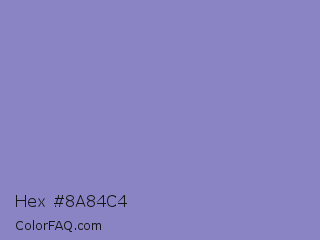 Hex #8a84c4 Color is a light indigo color and the nearest color is Ube #8878c3. Hex code #8a84c4 and RGB value is rgb(138,132,196). In RGB color space, this color is composed of 54% red, 52% green, 77% blue, In CMYK color space, this color is composed of 30% cyan, 33% magenta, 0% yellow , 23% black , In HSL color space, this color has a hue angle of 246° , 35% saturation and 64% lightness.