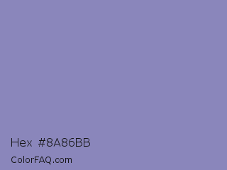 Hex #8a86bb Color is a light indigo color and the nearest color is Ube #8878c3. Hex code #8a86bb and RGB value is rgb(138,134,187). In RGB color space, this color is composed of 54% red, 53% green, 73% blue, In CMYK color space, this color is composed of 26% cyan, 28% magenta, 0% yellow , 27% black , In HSL color space, this color has a hue angle of 245° , 28% saturation and 63% lightness.