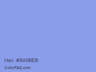 Hex #8a9be8 Color is a light blue color and the nearest color is Portage #8b9fee. Hex code #8a9be8 and RGB value is rgb(138,155,232). In RGB color space, this color is composed of 54% red, 61% green, 91% blue, In CMYK color space, this color is composed of 41% cyan, 33% magenta, 0% yellow , 9% black , In HSL color space, this color has a hue angle of 229° , 67% saturation and 73% lightness.