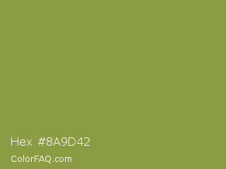 Hex #8a9d42 Color is a normal lime color and the nearest color is Sushi #87ab39. Hex code #8a9d42 and RGB value is rgb(138,157,66). In RGB color space, this color is composed of 54% red, 62% green, 26% blue, In CMYK color space, this color is composed of 12% cyan, 0% magenta, 58% yellow , 38% black , In HSL color space, this color has a hue angle of 73° , 41% saturation and 44% lightness.