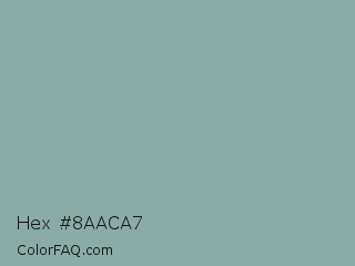 Hex #8aaca7 Color is a light cyan color and the nearest color is Cascade #8ba9a5. Hex code #8aaca7 and RGB value is rgb(138,172,167). In RGB color space, this color is composed of 54% red, 67% green, 65% blue, In CMYK color space, this color is composed of 20% cyan, 0% magenta, 3% yellow , 33% black , In HSL color space, this color has a hue angle of 171° , 17% saturation and 61% lightness.