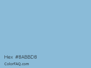 Hex #8abbd8 Color is a light blue color and the nearest color is Dark Sky Blue #8cbed6. Hex code #8abbd8 and RGB value is rgb(138,187,216). In RGB color space, this color is composed of 54% red, 73% green, 85% blue, In CMYK color space, this color is composed of 36% cyan, 13% magenta, 0% yellow , 15% black , In HSL color space, this color has a hue angle of 202° , 50% saturation and 69% lightness.