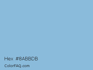 Hex #8abbdb Color is a light blue color and the nearest color is Dark Sky Blue #8cbed6. Hex code #8abbdb and RGB value is rgb(138,187,219). In RGB color space, this color is composed of 54% red, 73% green, 86% blue, In CMYK color space, this color is composed of 37% cyan, 15% magenta, 0% yellow , 14% black , In HSL color space, this color has a hue angle of 204° , 53% saturation and 70% lightness.