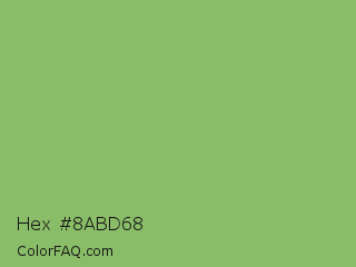 Hex #8abd68 Color is a normal green color and the nearest color is Dollar Bill #85bb65. Hex code #8abd68 and RGB value is rgb(138,189,104). In RGB color space, this color is composed of 54% red, 74% green, 41% blue, In CMYK color space, this color is composed of 27% cyan, 0% magenta, 45% yellow , 26% black , In HSL color space, this color has a hue angle of 96° , 39% saturation and 57% lightness.