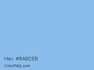 Hex #8abdeb Color is a light blue color and the nearest color is Jordy Blue #8ab9f1. Hex code #8abdeb and RGB value is rgb(138,189,235). In RGB color space, this color is composed of 54% red, 74% green, 92% blue, In CMYK color space, this color is composed of 41% cyan, 20% magenta, 0% yellow , 8% black , In HSL color space, this color has a hue angle of 208° , 71% saturation and 73% lightness.