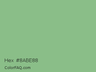 Hex #8abe88 Color is a light green color and the nearest color is Dark Sea Green #8fbc8f. Hex code #8abe88 and RGB value is rgb(138,190,136). In RGB color space, this color is composed of 54% red, 75% green, 53% blue, In CMYK color space, this color is composed of 27% cyan, 0% magenta, 28% yellow , 25% black , In HSL color space, this color has a hue angle of 118° , 29% saturation and 64% lightness.