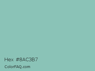 Hex #8ac3b7 Color is a light cyan color and the nearest color is Shadow Green #9ac2b8. Hex code #8ac3b7 and RGB value is rgb(138,195,183). In RGB color space, this color is composed of 54% red, 76% green, 72% blue, In CMYK color space, this color is composed of 29% cyan, 0% magenta, 6% yellow , 24% black , In HSL color space, this color has a hue angle of 167° , 32% saturation and 65% lightness.
