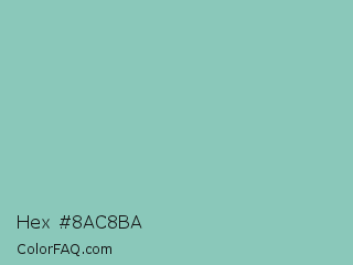 Hex #8ac8ba Color is a light cyan color and the nearest color is Monte Carlo #83d0c6. Hex code #8ac8ba and RGB value is rgb(138,200,186). In RGB color space, this color is composed of 54% red, 78% green, 73% blue, In CMYK color space, this color is composed of 31% cyan, 0% magenta, 7% yellow , 22% black , In HSL color space, this color has a hue angle of 166° , 36% saturation and 66% lightness.