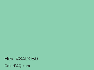 Hex #8ad0b0 Color is a light green color and the nearest color is Vista Blue #8fd6b4. Hex code #8ad0b0 and RGB value is rgb(138,208,176). In RGB color space, this color is composed of 54% red, 82% green, 69% blue, In CMYK color space, this color is composed of 34% cyan, 0% magenta, 15% yellow , 18% black , In HSL color space, this color has a hue angle of 153° , 43% saturation and 68% lightness.