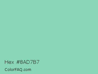 Hex #8ad7b7 Color is a light green color and the nearest color is Vista Blue #8fd6b4. Hex code #8ad7b7 and RGB value is rgb(138,215,183). In RGB color space, this color is composed of 54% red, 84% green, 72% blue, In CMYK color space, this color is composed of 36% cyan, 0% magenta, 15% yellow , 16% black , In HSL color space, this color has a hue angle of 155° , 49% saturation and 69% lightness.