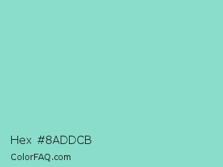 Hex #8addcb Color is a light cyan color and the nearest color is Middle Blue Green #8dd9cc. Hex code #8addcb and RGB value is rgb(138,221,203). In RGB color space, this color is composed of 54% red, 87% green, 80% blue, In CMYK color space, this color is composed of 38% cyan, 0% magenta, 8% yellow , 13% black , In HSL color space, this color has a hue angle of 167° , 55% saturation and 70% lightness.