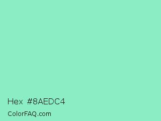 Hex #8aedc4 Color is a light green color and the nearest color is Algae Green #93dfb8. Hex code #8aedc4 and RGB value is rgb(138,237,196). In RGB color space, this color is composed of 54% red, 93% green, 77% blue, In CMYK color space, this color is composed of 42% cyan, 0% magenta, 17% yellow , 7% black , In HSL color space, this color has a hue angle of 155° , 73% saturation and 74% lightness.