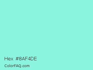 Hex #8af4de Color is a light cyan color and the nearest color is Riptide #8be6d8. Hex code #8af4de and RGB value is rgb(138,244,222). In RGB color space, this color is composed of 54% red, 96% green, 87% blue, In CMYK color space, this color is composed of 43% cyan, 0% magenta, 9% yellow , 4% black , In HSL color space, this color has a hue angle of 168° , 83% saturation and 75% lightness.