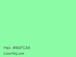Hex #8afca6 Color is a light green color and the nearest color is Pale Green #98fb98. Hex code #8afca6 and RGB value is rgb(138,252,166). In RGB color space, this color is composed of 54% red, 99% green, 65% blue, In CMYK color space, this color is composed of 45% cyan, 0% magenta, 34% yellow , 1% black , In HSL color space, this color has a hue angle of 135° , 95% saturation and 76% lightness.