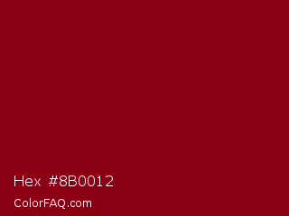 Hex #8b0012 Color is a dark red color and the nearest color is Red Devil #860111. Hex code #8b0012 and RGB value is rgb(139,0,18). In RGB color space, this color is composed of 55% red, 0% green, 7% blue, In CMYK color space, this color is composed of 0% cyan, 100% magenta, 87% yellow , 45% black , In HSL color space, this color has a hue angle of 352° , 100% saturation and 27% lightness.