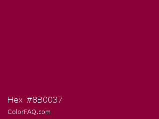 Hex #8b0037 Color is a dark rose color and the nearest color is Pink Raspberry #980036. Hex code #8b0037 and RGB value is rgb(139,0,55). In RGB color space, this color is composed of 55% red, 0% green, 22% blue, In CMYK color space, this color is composed of 0% cyan, 100% magenta, 60% yellow , 45% black , In HSL color space, this color has a hue angle of 336° , 100% saturation and 27% lightness.