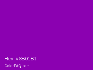 Hex #8b01b1 Color is a normal purple color and the nearest color is Violet RYB #8601af. Hex code #8b01b1 and RGB value is rgb(139,1,177). In RGB color space, this color is composed of 55% red, 0% green, 69% blue, In CMYK color space, this color is composed of 21% cyan, 99% magenta, 0% yellow , 31% black , In HSL color space, this color has a hue angle of 287° , 99% saturation and 35% lightness.
