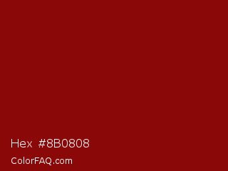 Hex #8b0808 Color is a dark red color and the nearest color is Sangria #92000a. Hex code #8b0808 and RGB value is rgb(139,8,8). In RGB color space, this color is composed of 55% red, 3% green, 3% blue, In CMYK color space, this color is composed of 0% cyan, 94% magenta, 94% yellow , 45% black , In HSL color space, this color has a hue angle of 0° , 89% saturation and 29% lightness.
