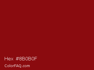 Hex #8b0b0f Color is a dark red color and the nearest color is Red Devil #860111. Hex code #8b0b0f and RGB value is rgb(139,11,15). In RGB color space, this color is composed of 55% red, 4% green, 6% blue, In CMYK color space, this color is composed of 0% cyan, 92% magenta, 89% yellow , 45% black , In HSL color space, this color has a hue angle of 358° , 85% saturation and 29% lightness.