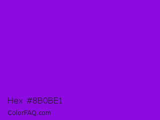 Hex #8b0be1 Color is a normal purple color and the nearest color is French Violet #8806ce. Hex code #8b0be1 and RGB value is rgb(139,11,225). In RGB color space, this color is composed of 55% red, 4% green, 88% blue, In CMYK color space, this color is composed of 38% cyan, 95% magenta, 0% yellow , 12% black , In HSL color space, this color has a hue angle of 276° , 91% saturation and 46% lightness.