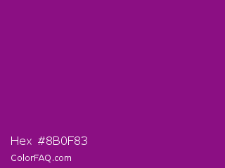 Hex #8b0f83 Color is a dark magenta color and the nearest color is Mardi Gras #880085. Hex code #8b0f83 and RGB value is rgb(139,15,131). In RGB color space, this color is composed of 55% red, 6% green, 51% blue, In CMYK color space, this color is composed of 0% cyan, 89% magenta, 6% yellow , 45% black , In HSL color space, this color has a hue angle of 304° , 81% saturation and 30% lightness.