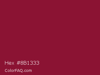 Hex #8b1333 Color is a normal rose color and the nearest color is Antique Ruby #841b2d. Hex code #8b1333 and RGB value is rgb(139,19,51). In RGB color space, this color is composed of 55% red, 7% green, 20% blue, In CMYK color space, this color is composed of 0% cyan, 86% magenta, 63% yellow , 45% black , In HSL color space, this color has a hue angle of 344° , 76% saturation and 31% lightness.