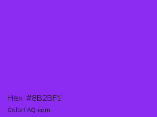 Hex #8b2bf1 Color is a normal violet color and the nearest color is Blue Violet #8a2be2. Hex code #8b2bf1 and RGB value is rgb(139,43,241). In RGB color space, this color is composed of 55% red, 17% green, 95% blue, In CMYK color space, this color is composed of 42% cyan, 82% magenta, 0% yellow , 5% black , In HSL color space, this color has a hue angle of 269° , 88% saturation and 56% lightness.