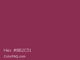 Hex #8b2c51 Color is a normal rose color and the nearest color is Dark Raspberry #872657. Hex code #8b2c51 and RGB value is rgb(139,44,81). In RGB color space, this color is composed of 55% red, 17% green, 32% blue, In CMYK color space, this color is composed of 0% cyan, 68% magenta, 42% yellow , 45% black , In HSL color space, this color has a hue angle of 337° , 52% saturation and 36% lightness.