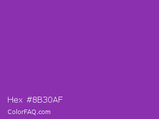 Hex #8b30af Color is a normal purple color and the nearest color is Grape #6f2da8. Hex code #8b30af and RGB value is rgb(139,48,175). In RGB color space, this color is composed of 55% red, 19% green, 69% blue, In CMYK color space, this color is composed of 21% cyan, 73% magenta, 0% yellow , 31% black , In HSL color space, this color has a hue angle of 283° , 57% saturation and 44% lightness.