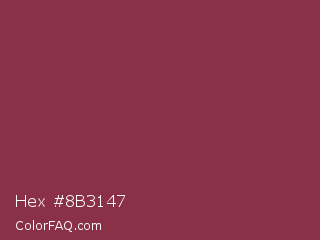Hex #8b3147 Color is a normal red color and the nearest color is Solid Pink #893843. Hex code #8b3147 and RGB value is rgb(139,49,71). In RGB color space, this color is composed of 55% red, 19% green, 28% blue, In CMYK color space, this color is composed of 0% cyan, 65% magenta, 49% yellow , 45% black , In HSL color space, this color has a hue angle of 345° , 48% saturation and 37% lightness.