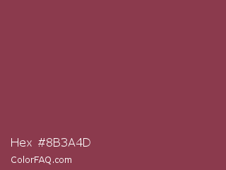 Hex #8b3a4d Color is a normal red color and the nearest color is Cordovan #893f45. Hex code #8b3a4d and RGB value is rgb(139,58,77). In RGB color space, this color is composed of 55% red, 23% green, 30% blue, In CMYK color space, this color is composed of 0% cyan, 58% magenta, 45% yellow , 45% black , In HSL color space, this color has a hue angle of 346° , 41% saturation and 39% lightness.