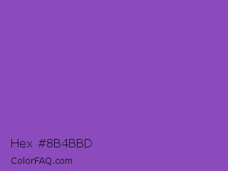 Hex #8b4bbd Color is a normal purple color and the nearest color is Deep Lilac #9955bb. Hex code #8b4bbd and RGB value is rgb(139,75,189). In RGB color space, this color is composed of 55% red, 29% green, 74% blue, In CMYK color space, this color is composed of 26% cyan, 60% magenta, 0% yellow , 26% black , In HSL color space, this color has a hue angle of 274° , 46% saturation and 52% lightness.