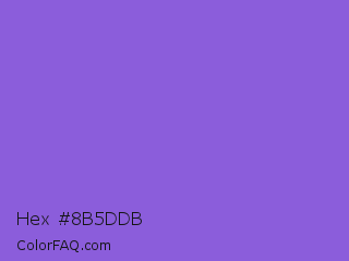 Hex #8b5ddb Color is a light violet color and the nearest color is Navy Purple #9457eb. Hex code #8b5ddb and RGB value is rgb(139,93,219). In RGB color space, this color is composed of 55% red, 36% green, 86% blue, In CMYK color space, this color is composed of 37% cyan, 58% magenta, 0% yellow , 14% black , In HSL color space, this color has a hue angle of 262° , 64% saturation and 61% lightness.