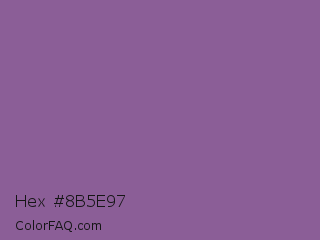Hex #8b5e97 Color is a normal purple color and the nearest color is Trendy Pink #8c6495. Hex code #8b5e97 and RGB value is rgb(139,94,151). In RGB color space, this color is composed of 55% red, 37% green, 59% blue, In CMYK color space, this color is composed of 8% cyan, 38% magenta, 0% yellow , 41% black , In HSL color space, this color has a hue angle of 287° , 23% saturation and 48% lightness.