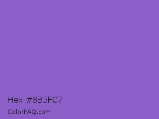 Hex #8b5fc7 Color is a normal violet color and the nearest color is Amethyst #9966cc. Hex code #8b5fc7 and RGB value is rgb(139,95,199). In RGB color space, this color is composed of 55% red, 37% green, 78% blue, In CMYK color space, this color is composed of 30% cyan, 52% magenta, 0% yellow , 22% black , In HSL color space, this color has a hue angle of 265° , 48% saturation and 58% lightness.