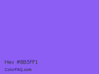 Hex #8b5ff1 Color is a light indigo color and the nearest color is Navy Purple #9457eb. Hex code #8b5ff1 and RGB value is rgb(139,95,241). In RGB color space, this color is composed of 55% red, 37% green, 95% blue, In CMYK color space, this color is composed of 42% cyan, 61% magenta, 0% yellow , 5% black , In HSL color space, this color has a hue angle of 258° , 84% saturation and 66% lightness.